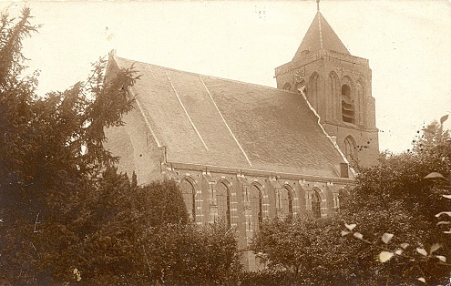 Kerkbouw gezien vanuit de pastorie, voor de brand van 1935